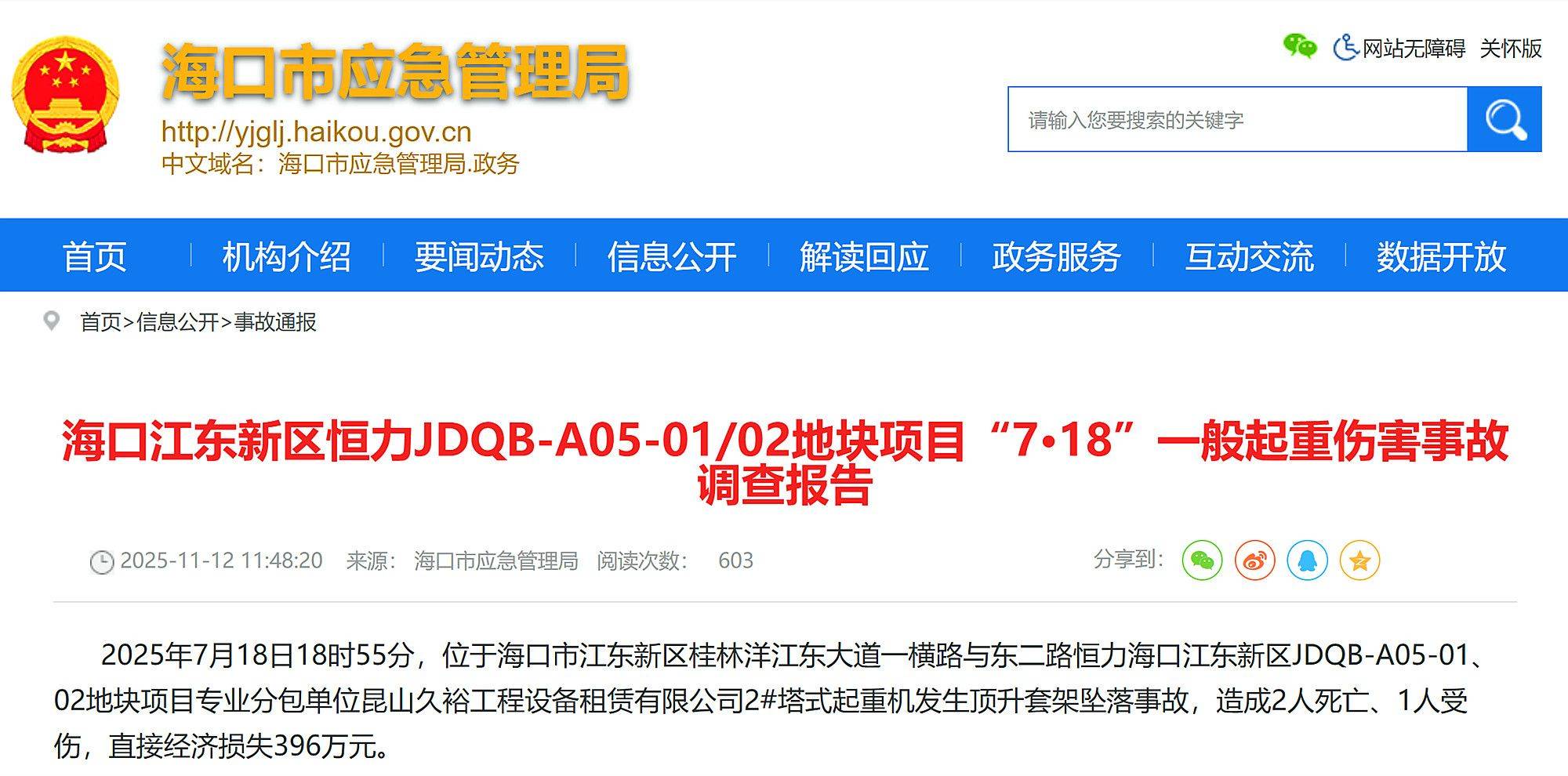 经查询拜访认定,海口江东新区恒力JDQB-A05-01/02地块项目“7·18”起沉变乱是一路一般出产平安义务变乱。