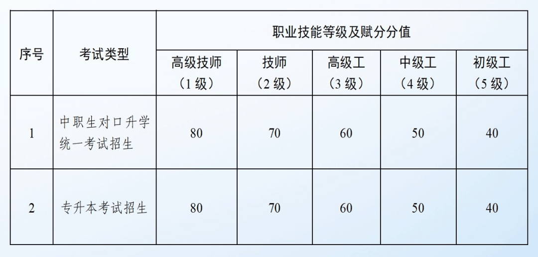 6。技术赋分。专科阶段获得的职业技术竞赛项、职业技术品级2个项目,将通过赋分体例转换每个项目标成就。该成就计入专升本测验总成就,且2个项目成就可累加计较。考生取得的职业技术竞赛获项目、职业技术品级,须取报考的测验类别相关方可赋分。